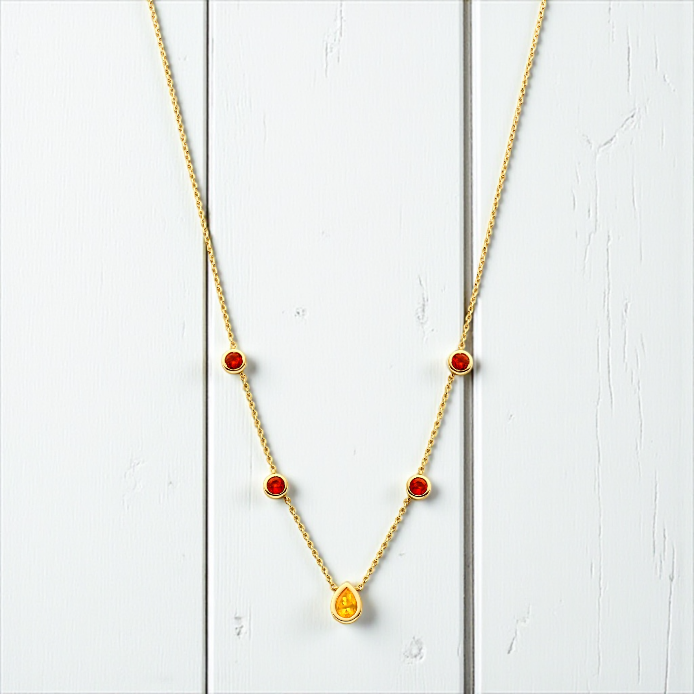 Citrines take center stage in this necklace, a delicate pear-shaped citrine alongside four round stones in different shades, all set in warm rose gold.