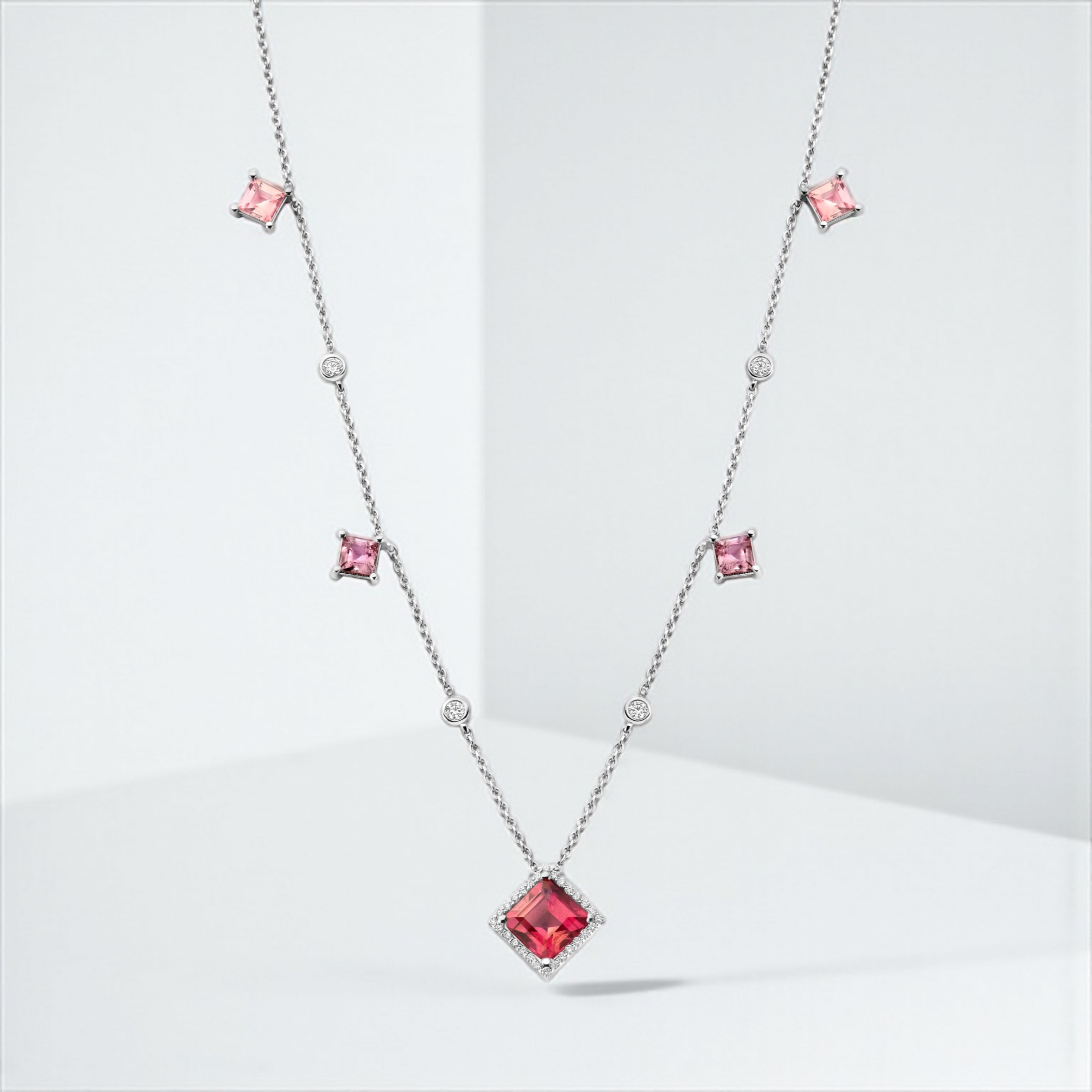 Rosé Carré captures the light of a late summer evening, when the sky gently turns to shades of pink.At its heart lies a square-cut tourmaline, embraced by four smaller tourmalines in perfect harmony.